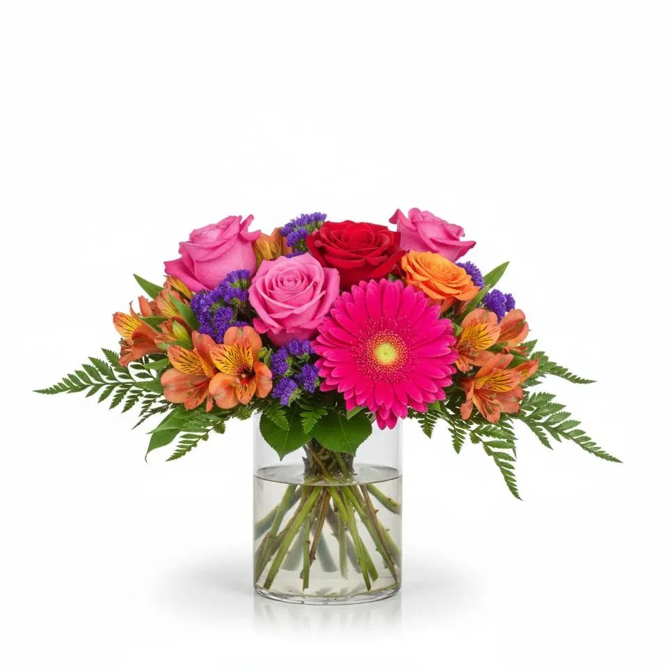 Ignite joy with our Fireside Fiesta! This vibrant arrangement of hot pink roses, orange alstroemeria, and cheerful gerbera daisies creates a heartwarming celebration of color. It's the perfect centerpiece to bring warmth and festivity to any occasion.