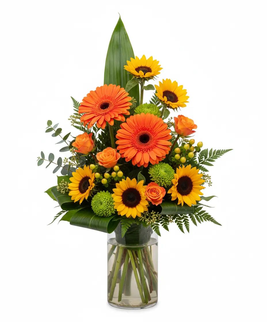 Brighten any day with our Happy Harvest! Featuring vibrant sunflowers, roses, and gerberas, it's a perfect gift. Order fresh seasonal flowers today!