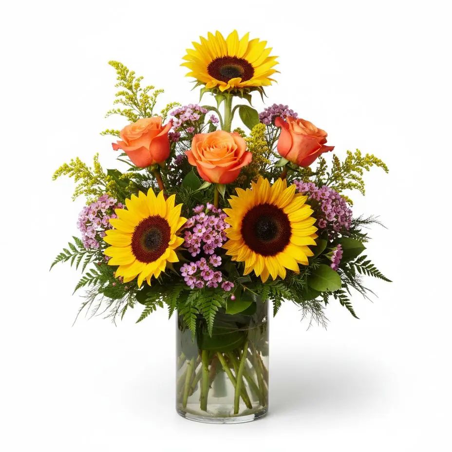 Celebrate the vibrant beauty of autumn with our Harvest Glow! This stunning bouquet features cheerful sunflowers, rich orange roses, and radiant yellow solidago, perfectly complemented by delicate purple waxflower and lush greens. It's an ideal gift to brighten any day and bring the warmth of harvest season indoors.