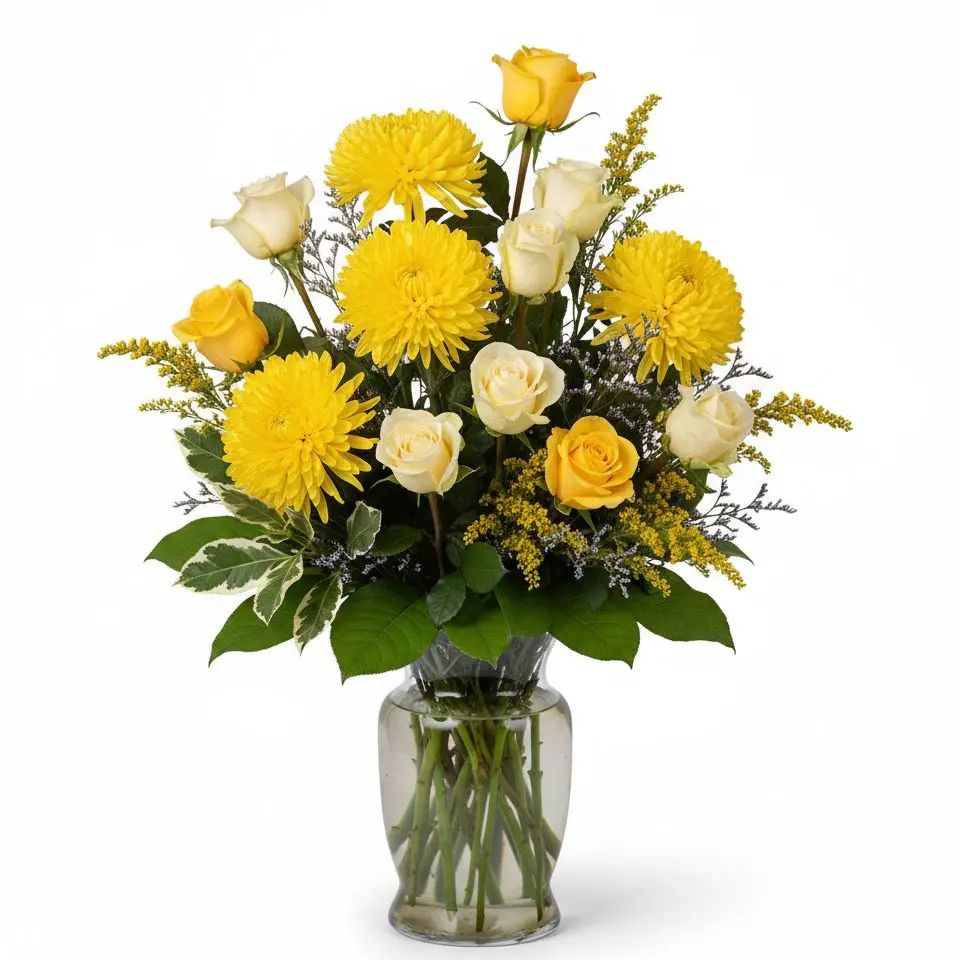Celebrate life's special moments with the Everlasting Elegance Bouquet, a stunning arrangement designed to bring joy and beauty to any occasion. Featuring vibrant roses, cheerful chrysanthemums, and delicate filler flowers, this bouquet embodies grace and lasting charm. It's the perfect gift to express heartfelt sentiments and create unforgettable memories.
