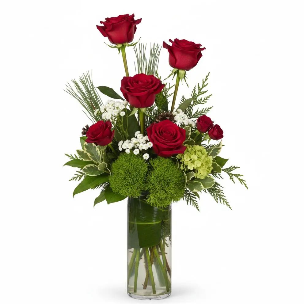 "Crimson Winter's Kiss" delivers a breathtaking embrace of the season's finest blooms, combining rich red roses with delicate spray roses and mini green hydrangeas. Beautifully complemented by festive winter greens and white statice, this exquisite arrangement evokes warmth and joy. It's the perfect way to bring elegance and holiday cheer to any home.